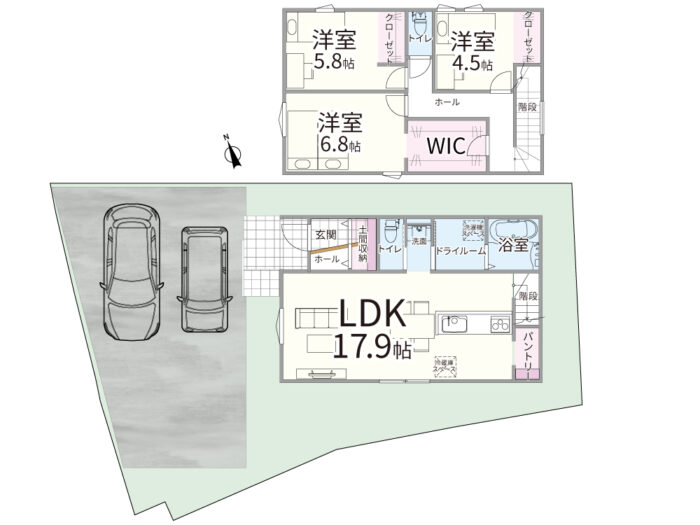 【1階】LDK(17.9帖)、水回り、パントリー、土間収納、玄関 【2階】洋室(6.8帖)+WIC(3帖)、収納付き洋室(4.5帖、5.8帖)、トイレ