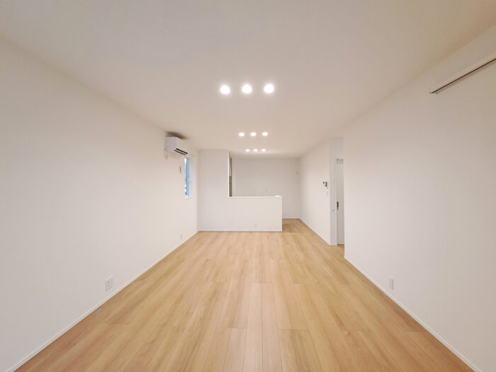 キッチンからダイニング、リビングへと一直線につながる間取り。視線が抜けて、開放感たっぷり。家族の気配を感じながら過ごせるLDKです。