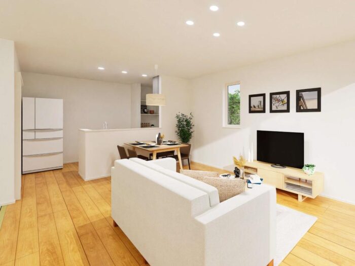 リビング・ダイニング・キッチンが一直線に並ぶ間取り。家族の会話や笑顔が自然と広がる、心地よい暮らしを叶えます。