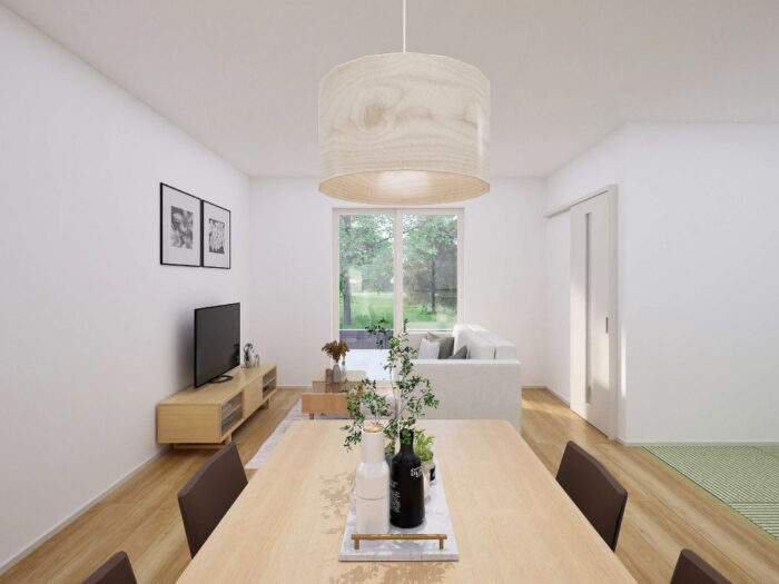 南向きの窓から光がたっぷり差し込むLDK。明るく開放的な空間で、家族の時間を心地よく過ごせます。