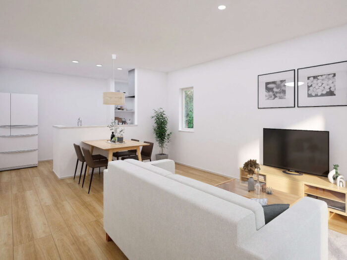 リビング・ダイニング・キッチンが一直線に並ぶ間取り。家族の会話や笑顔が自然と広がる、心地よい暮らしを叶えます。