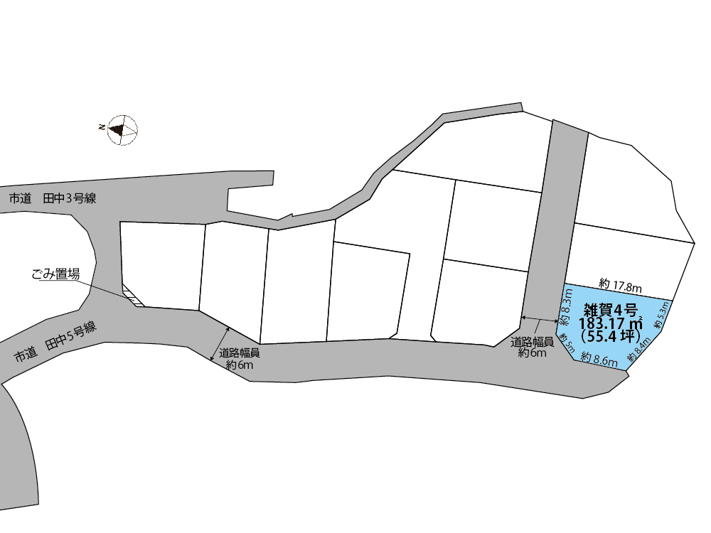 | 私道負担・道路 | 無、北6m幅(接道幅13.3m)、西6m幅(接道幅8.6m) | 諸費用 | 水道メーター分担金、仲介手数料 |
