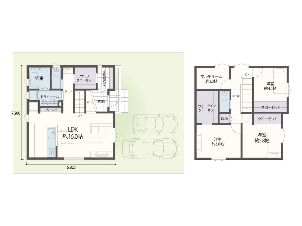 2階:洋室(6帖)+ウォークインクローゼット、収納付き洋室(5.8帖、4.5帖)、マルチルーム(3帖)、収納、トイレ