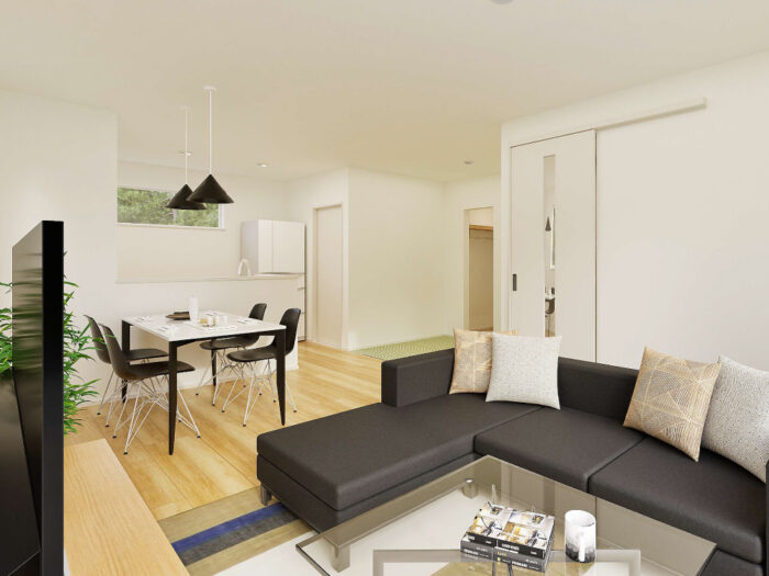 キッチン、ダイニング、リビングを一直線に配置した効率的なLDK。