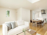 大きな窓からたっぷりと光が降りそそぎ、吹き抜けのある空間は実際の広さ以上にゆとりを感じられます。明るく開放的なリビングは、ご家族が自然と集まる心地よい場所に。