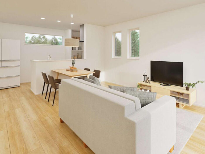 3面に窓を設けたことで、日中はたっぷりと自然光が差し込み、明るく開放的なLDKに。風通しもよく、家族みんなが心地よく過ごせる空間です。