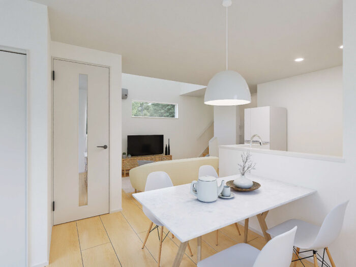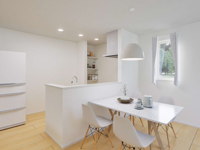 対面キッチンからリビング全体を見渡せるL字型LDK。料理をしながら家族と会話を楽しめる、心地よい距離感です。自然と笑顔が集まる、家族の中心となる空間です。