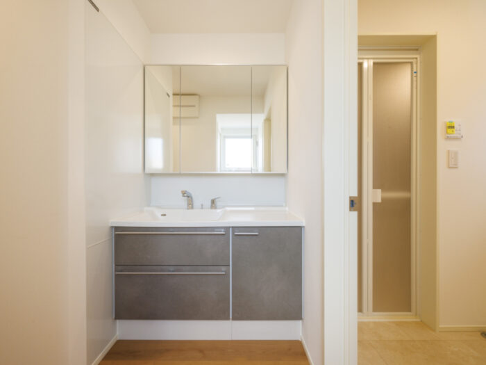 トコスホームオリジナル洗面スペースを造作。玄関や各居室からもアクセスしやすい配置です。※タカラスタンダード製エリシオ
