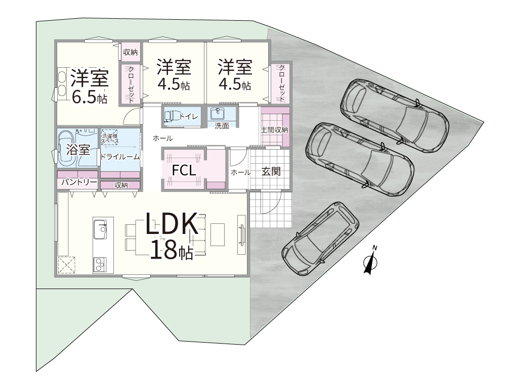 LDK(18帖)、水まわり、パントリー、FCL、収納、玄関、土間収納、収納付き居室(6.5帖)、収納付き居室(4.5帖×2)