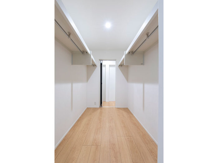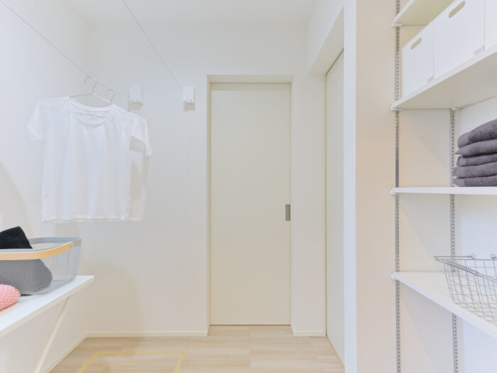 回遊性のある動線で、家事効率を高めます。衣類や生活用品をまとめて収納でき、空間もすっきり。