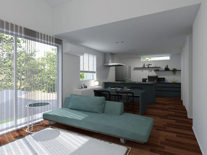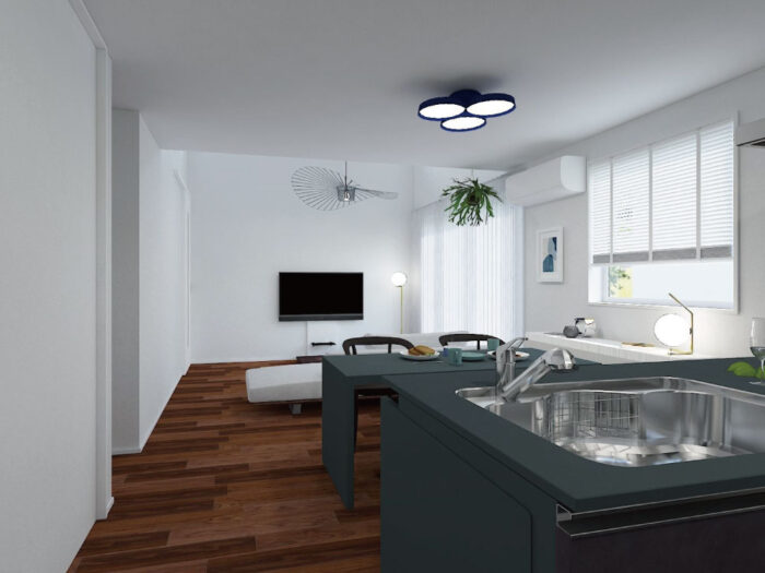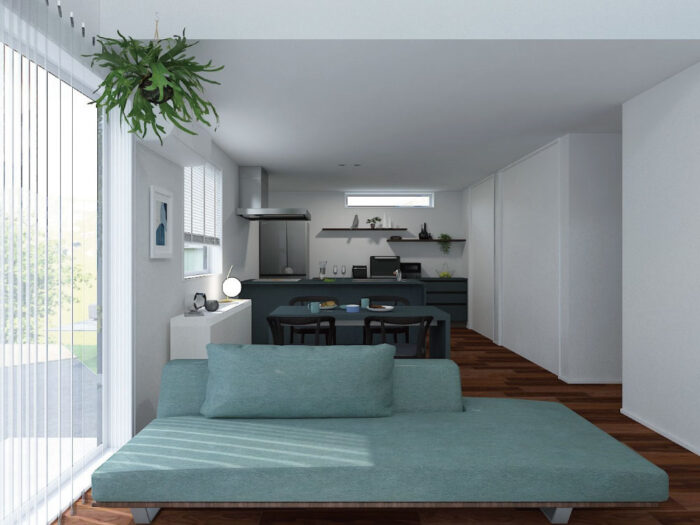 一直線にレイアウトしたLDKは、視線が抜けて開放的。調理から食事、くつろぎまでがスムーズにつながります。シンプルでスタイリッシュな空間設計です。